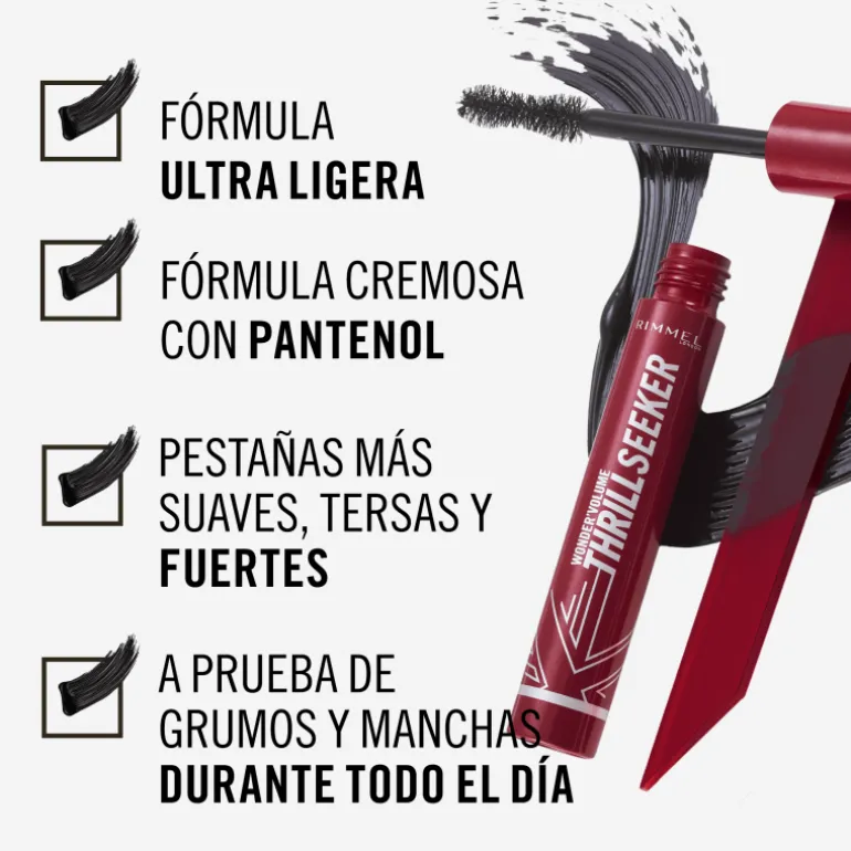 #SienteLaAdrenalina. Pestañas con mega volumen y sensación ultra ligera. Definición máxima y longitud que desafia la gravedad. Fórmula cremosa. Larga duración. A prueba de manchas y grumos durante todo el día. Formulada con pantenol para unas pestañas más suaves, tersas y fuertes. Aplicación hiper suave. Apto para ojos sensibles.